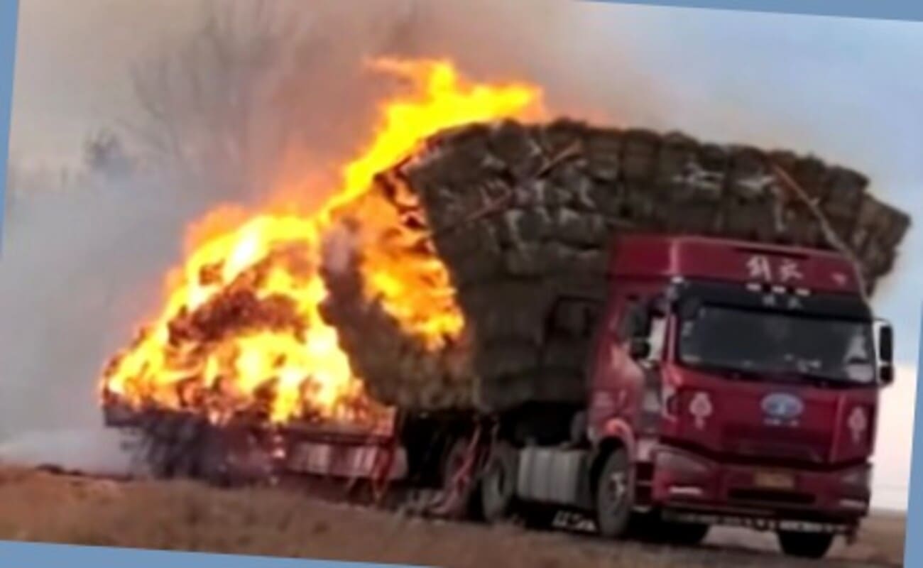 Китайский дальнобойщик несколько километров прокладывал опасный маршрут с горящи