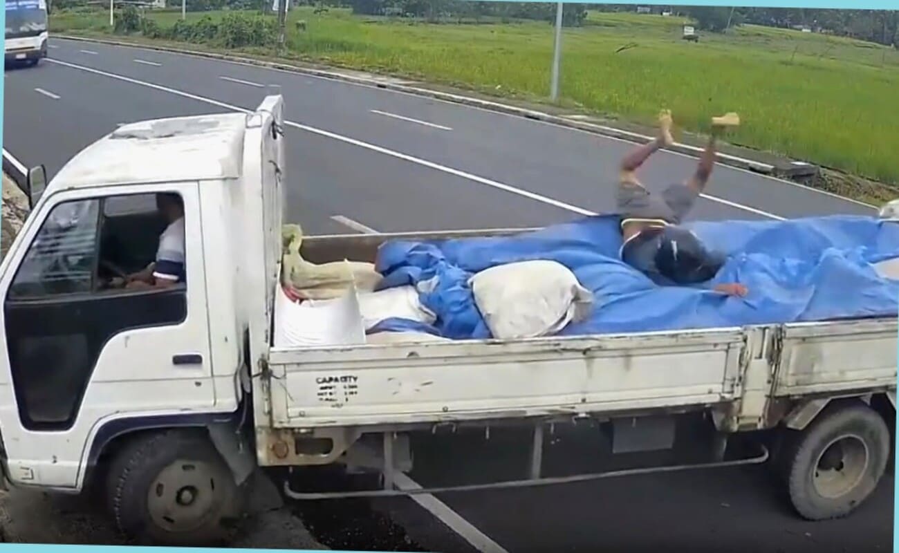 Мотоциклист мягко приземлился в кузове перегородившего движение грузовика