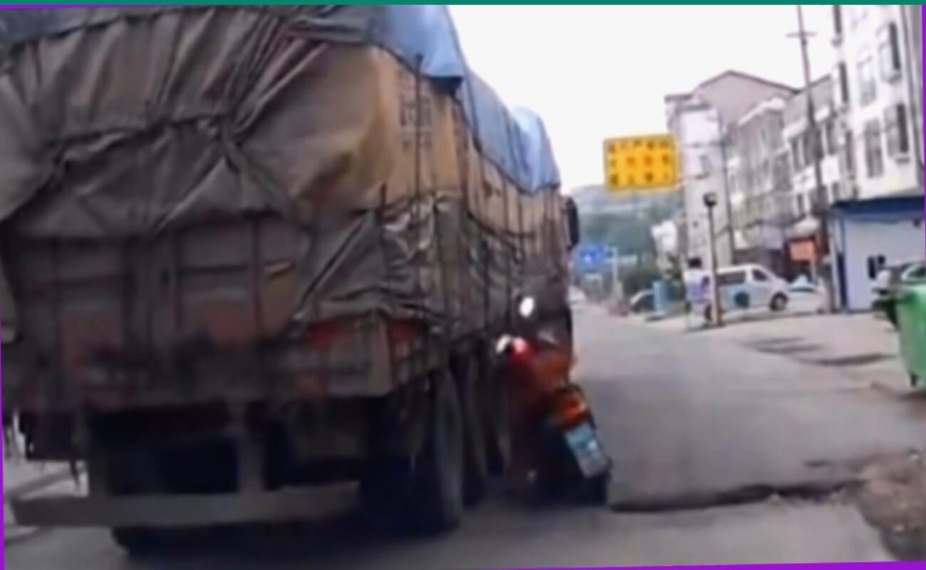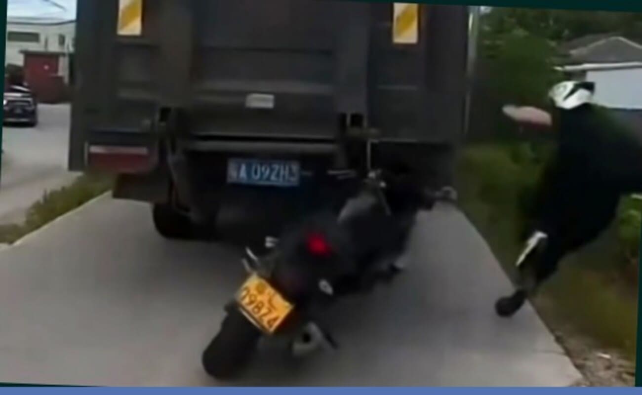 Мотоциклист едва не погиб под колёсами большегруза и попал на видео в Китае