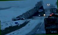 Случайный участник дорожного движения, прокладывающий маршрут на своей легковушке по заснеженной китайской магистрали, запечатлел обрушение фуры в кювет.