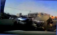 Участник дорожного движения, ожидающий разрешительного сигнала светофора в салоне своего автомобиля на оживлённом перекрёстке в Поднебесной, запечатлел стремительную аварийную ситуацию.