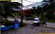 Видеокамера, установленная возле водоёма в районе Джалан Ризаб Зазули (Букит Хиджау, город Джерам, Малайзия) запечатлела столкновение легковушки и мотоциклиста.