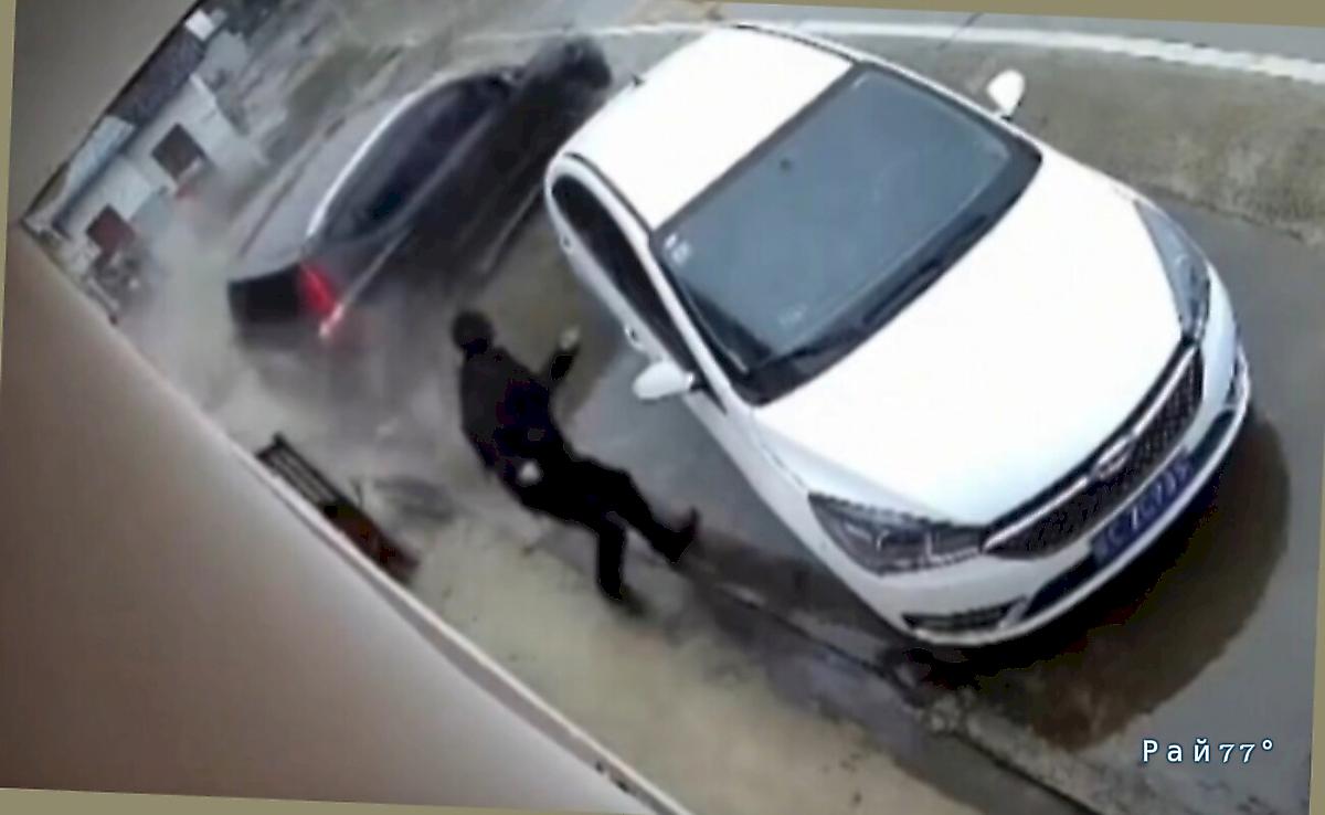 Легковушка чудом не сбила пешехода и попала на видео в КНР