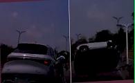 Участник велозаезда запечатлел появление автомобиля, который сбил велосипедистку, а затем врезался в столб и опрокинулся на бок.